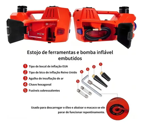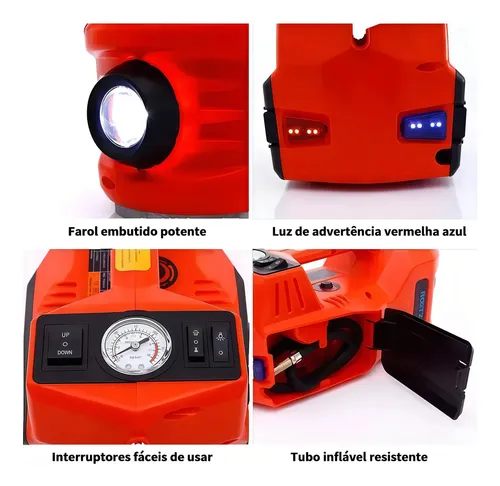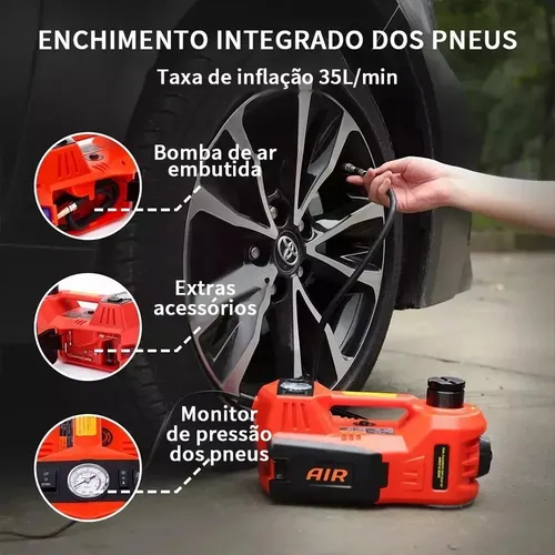 Além de elevar veículos, funciona como bomba infladora com pressão de até 150 PSI, perfeita para calibrar pneus de carros, motos, bicicletas e até bolas.